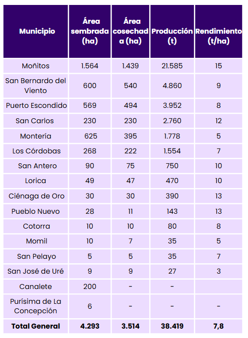 La producción se concentra en la zona costanera, principalmente en Moñitos, Puerto Escondido y San Bernardo del Viento, municipios que aportan más del 80 % del total, lo que posiciona a Córdoba con ventajas competitivas para el desarrollo de la cadena de valor del coco y sus derivados.